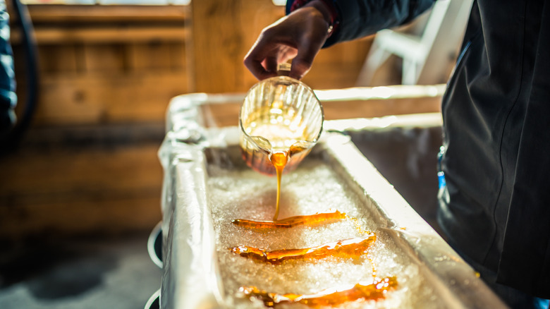 Sugar on snow requires two simple ingredients: maple syrup and freshly fallen snow (which New England admittedly has more than enough of). The syrup is boiled until it reaches the soft ball stage — meaning it's still pliable and quite sticky — before it's drizzled on the snow. Sugarhouses typically serve the maple syrup with sticks, so you can roll it up and enjoy it. It's a very New England thing, and since the sugaring season is so short, many people will not get to experience eating this tasty treat. However, you can still get your maple fix in the heat of summer with maple candy or grab a bag of maple cotton candy from a farmers market.