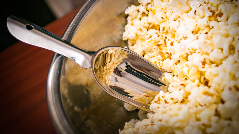 Nothing makes a TV night on the couch more satisfying than a bowl of warm, buttery, freshly popped popcorn. As addictive as your favorite bagged snack might be, it won't come close to satisfying like the kernels popping a la the movie theater of your childhood. Instantly, watching any show is going to be a more enjoyable experience. If you don't want to deal with the potentially charred mess of microwave popcorn, and the cumbersome popcorn popper is hidden somewhere in the depths of your cabinets (or you never had one at all), science-forward food expert Alton Brown has you covered. He suggests that the absolute best method for popping popcorn doesn't require any fancy equipment and, in fact, is best achieved using a simple stainless steel bowl. This kitchen staple, that you surely have on hand, can also double as the serving vessel for your popcorn, meaning absolutely zero mess and more time to rot on the couch. Cue the celebration emoji.