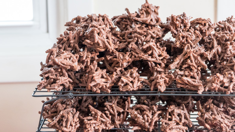 When you think of chow mein, a stir-fried noodle dish comes to mind (though don't confuse chow mein and lo mein). It's saucy and savory, sometimes spicy, and loaded with chunks of protein and veggies. These noodles are often served soft and boiled, like other types of pasta, and are common on every Chinese restaurant's menu. But the crunchy, deep-fried version of chow mein noodles is perfect for providing a whole lot of texture to sweets. They're what gives those nostalgic butterscotch haystacks their unique character — and are the centerpiece of dozens of spin-off desserts that deliver a sweet and satisfying crunch.