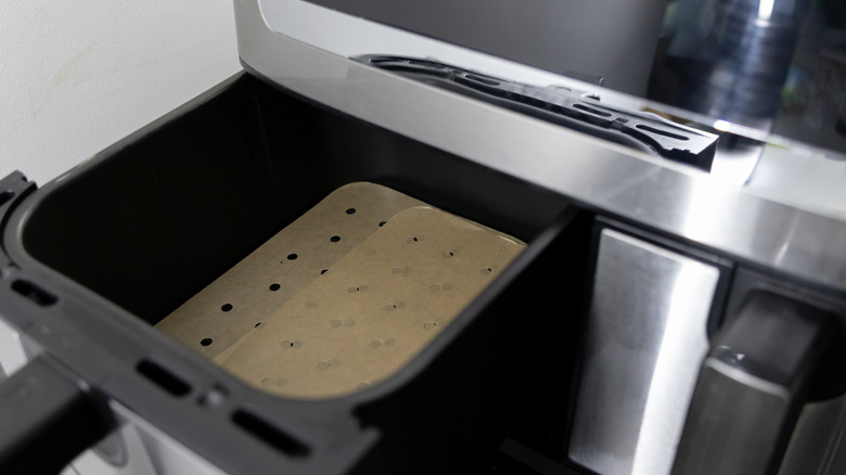 If you are determined not to leave any residue, there's an air fryer hack that works as a better alternative to aluminum foil: Perforated parchment paper. You can even buy a pack, such as the Dnssy 200-piece air fryer parchment paper liners, specially sized and designed for the air fryer. This option covers the bottom of the basket but still lets air come through the small holes. You could also cut parchment paper you have at home to fit it in the air fryer and pierce holes in it yourself.