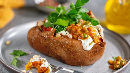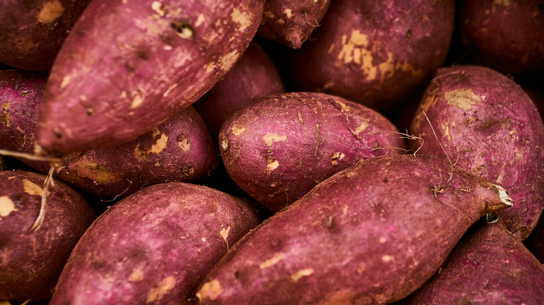 With a perfectly cooked sweet potato, you basically have a blank food canvas ready to get creative with. There are so many unique toppings you should be adding to sweet potatoes that extend far beyond just throwing some butter on it. Why not try a drizzle of tahini and some chili crisp, or crumbled feta with a squeeze of lemon? Have you ever tried sweet potato with hummus and some crispy roasted chickpeas on top? It's a winner. With the skin holding it all together, feel free to really load your sweet potato up — it can handle it.