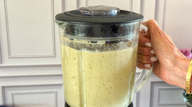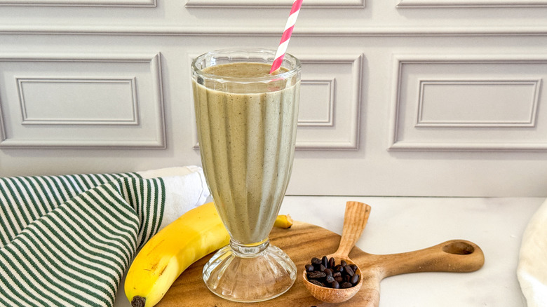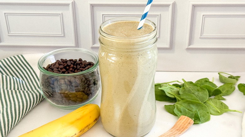 When it comes to high-protein breakfasts that will keep you fueled throughout the morning, a mere piece of toast or an apple just aren't going to get the job done. A balanced breakfast with protein, fat, and fiber is not only nourishing, but it will keep you feeling full and satisfied as the morning wears on. If you're rushed in the morning and don't have time for both coffee and a smoothie, why not combine them into a tasty plant-based smoothie that even has a hidden serving of spinach? It plant protein coffee smoothie tastes like an iced latte that is sweet and nutty, with a smooth, creamy texture.