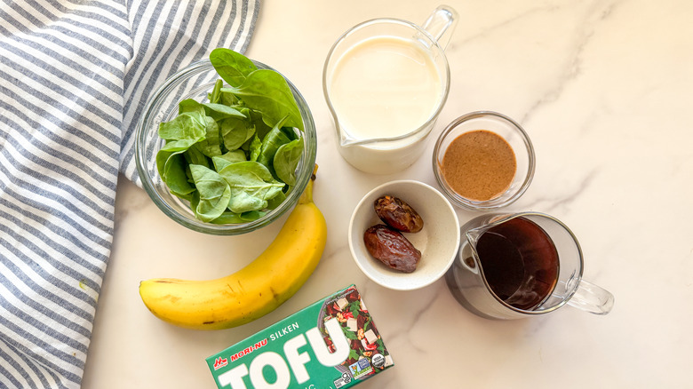 - Add the softened dates, tofu, cold brew coffee, soy milk, banana, almond butter, and spinach to a blender.