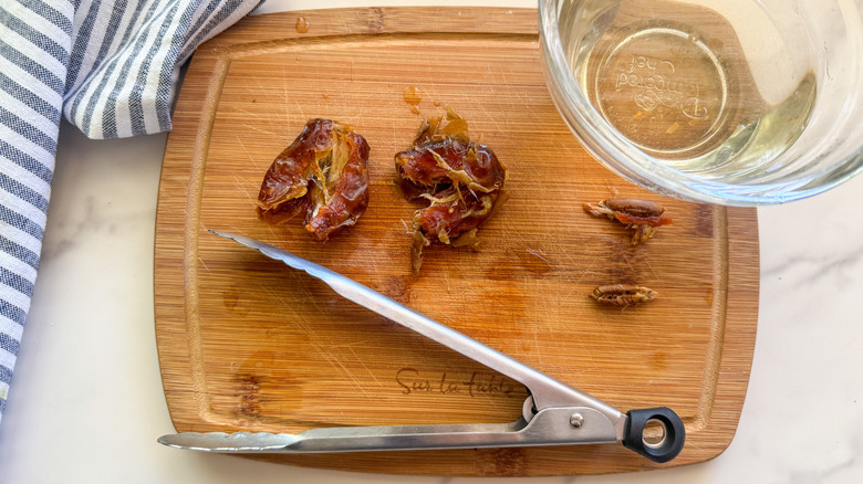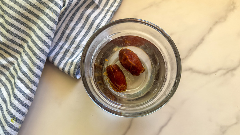 - Place the dates in a small bowl and cover with hot water. Let them sit for 15 minutes.