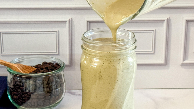 This plant protein coffee smoothie comes loaded with silken tofu, soy milk, cold brew, almond butter, and even a touch of spinach greens.