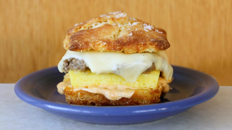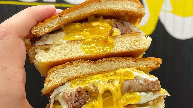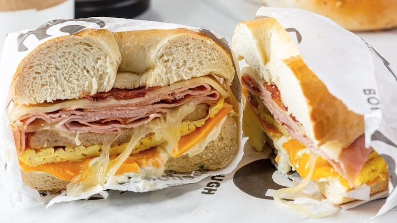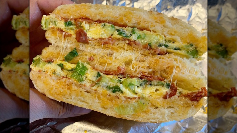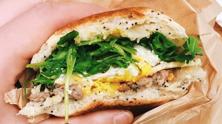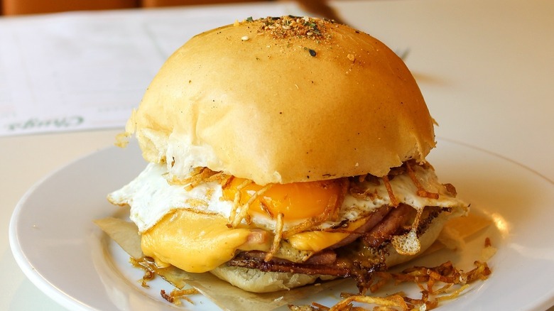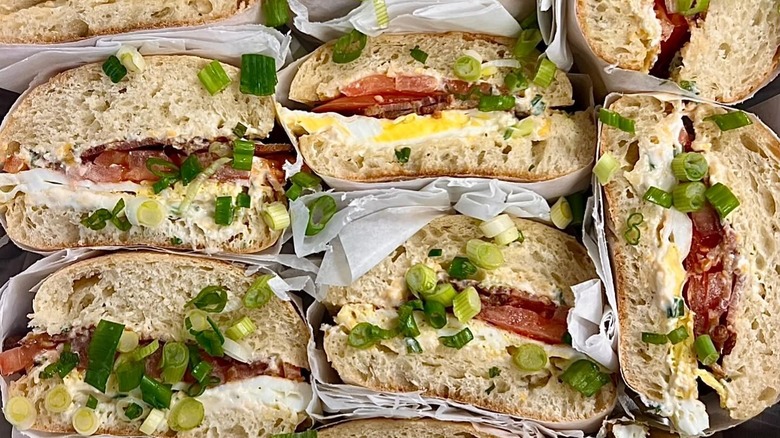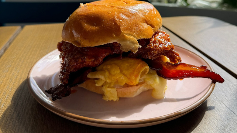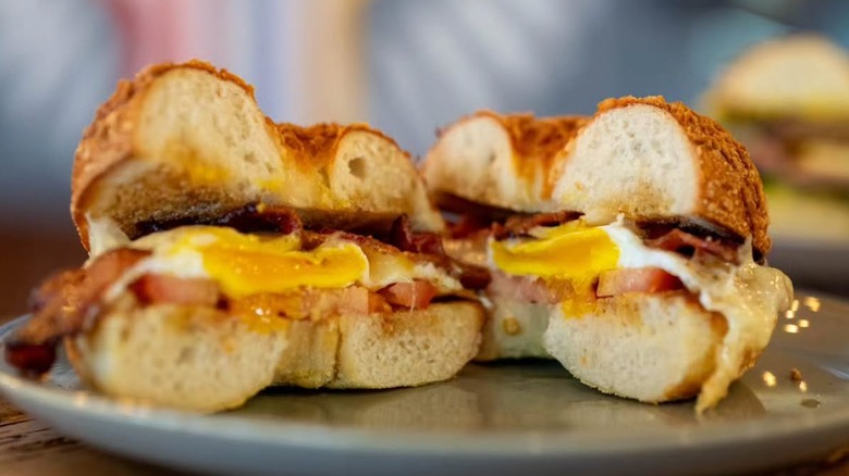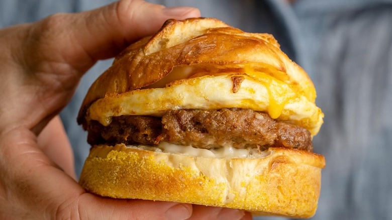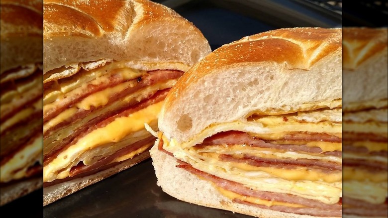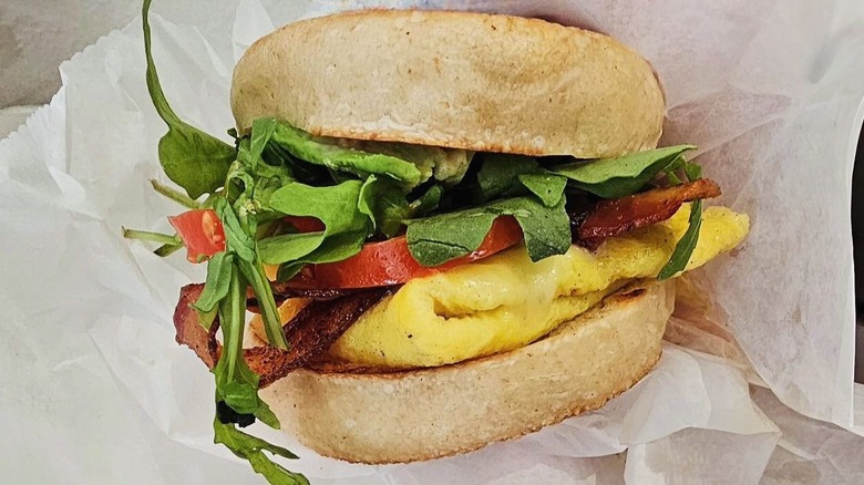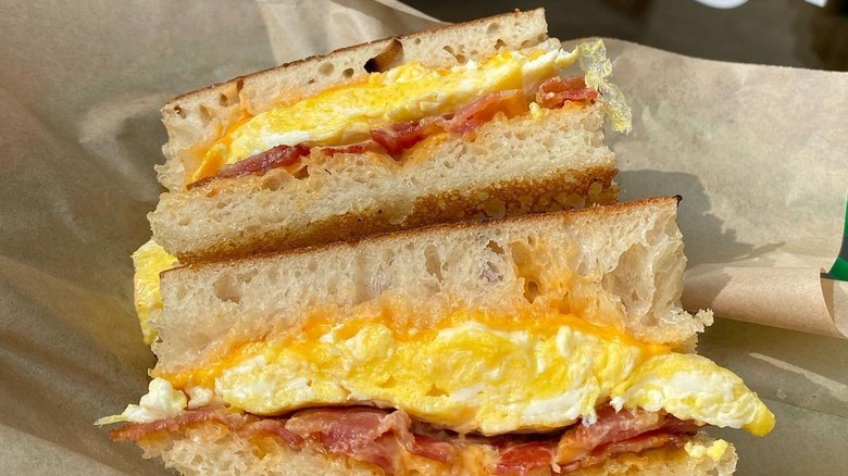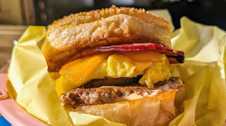Is there anything better than a super-stacked breakfast sandwich to start the day? You get all your essentials in one hand-held meal like fluffy bread, soft eggs, and maybe some meat and cheese. Perhaps you prefer luscious lox or smoked salmon on a chewy bagel with a crackly crust, or crispy chicken and a runny egg sandwiched between buttery biscuits. That's the great thing about breakfast sandwiches — they're incredibly versatile. However, some rise above the rest, of course.
