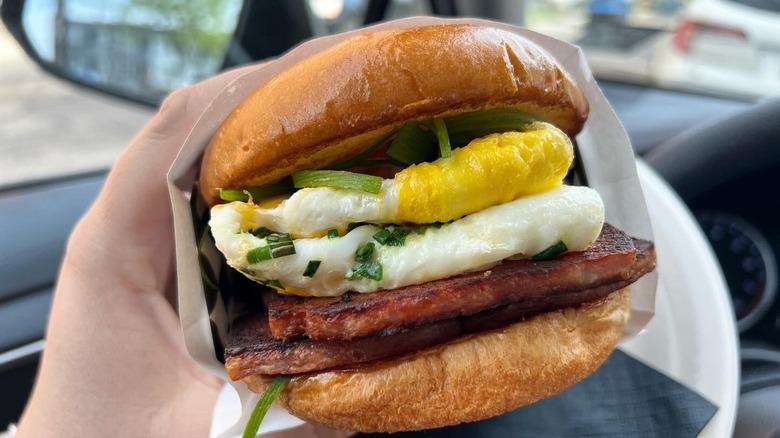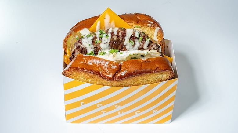 While there are plenty of places you can grab a good breakfast sandwich in California, one spot that gets resoundingly stellar reviews is Egg Tuck. The chain specializes in Korean-inspired egg sandwiches and burritos. The Royal West gets top billing for its burger-style patty stuffed into a soft brioche bun with an over medium egg, cheddar cheese, chives, pickles, grilled onions, and drizzles of Sriracha mayo and house mayo.