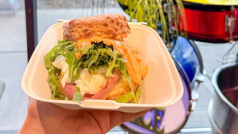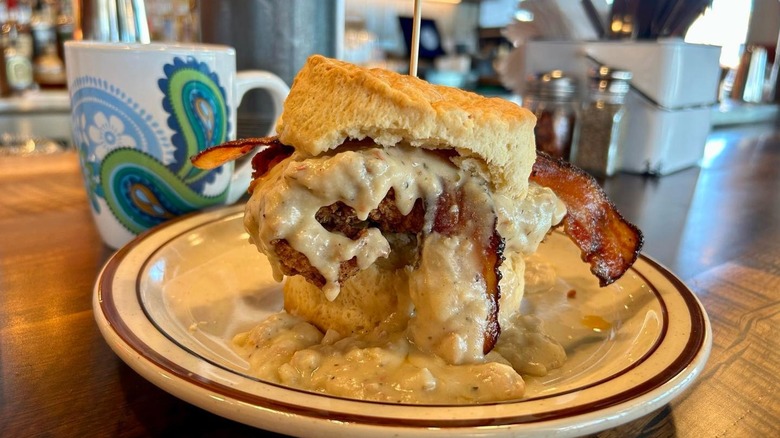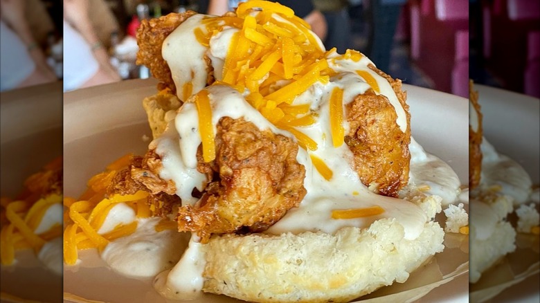 Created by James Beard award-winning chef John Currence, Big Bad Breakfast is all about hearty Southern breakfast dishes. It doesn't get more Southern than the Cathead Chicken Biscuit, served like an open-faced sandwich. It features a fluffy biscuit on the bottom and a piece of crispy fried chicken on top that's smothered in sausage gravy and sprinkled with cheddar cheese.