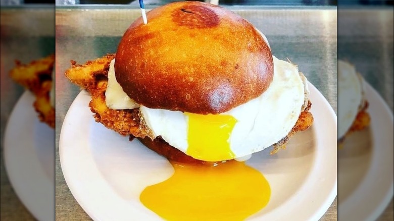 The Tasty Yolk started as a food truck serving classic and creative breakfast sandwiches, and now there are three brick and mortar shops in addition to the original food truck. The Banker sandwich gets called out consistently for hitting all the right spots. It features a toasted bun stuffed with brisket, two eggs, melted Swiss cheese, and spicy aioli. Fans say it's a seriously hearty hand-held meal.