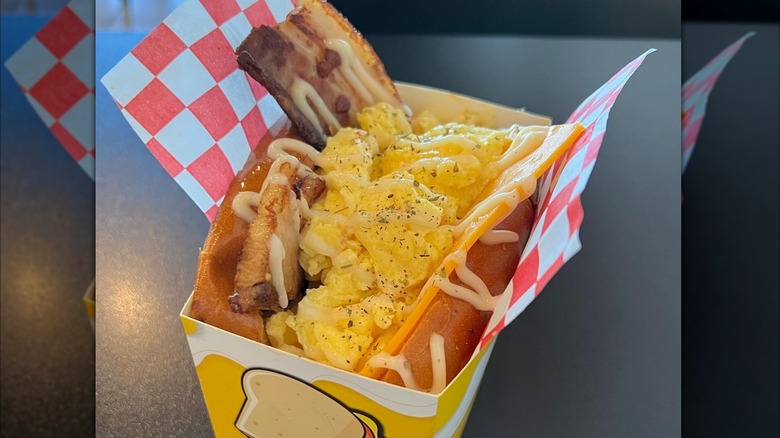 Las Vegas buffets may be legendary, but if you're craving something different for breakfast, make your way to Buldogis. Reviewers rave about the Pork Belly Egg Dropp sandwich, which features slices of charred pork belly, soft scrambled eggs, and cheddar cheese in toasted garlic herb bread. The final touch is a few passes of sweet Sriracha mayo and a dusting of herbs.