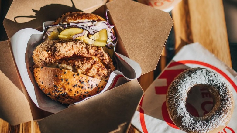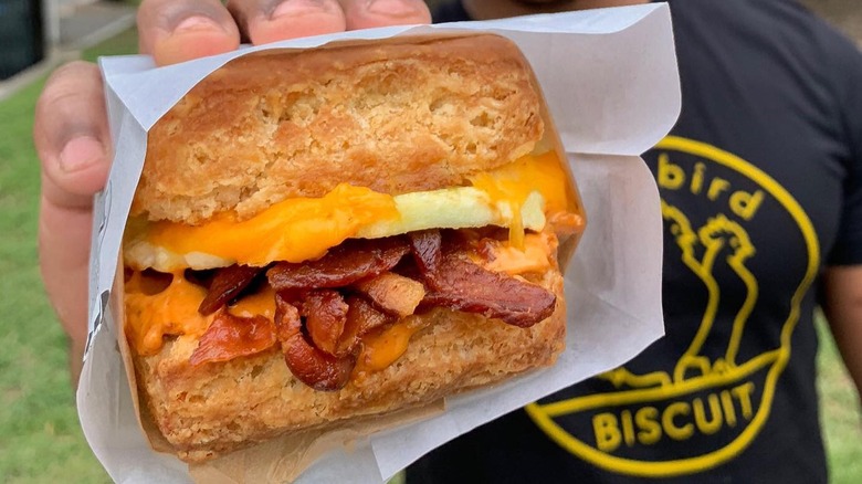 Founded by two friends with a passion for chicken and biscuits, Bird Bird Biscuit offers up delectable Southern-style breakfast sandwiches. The fried chicken sandwiches get a lot of praise, but many say you shouldn't sleep on the Bird Bird Bacon. It features a winning combo of an over-medium egg, plenty of bacon, cheese, and bacon-infused chipotle mayo on a buttery house-made biscuit.