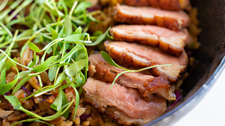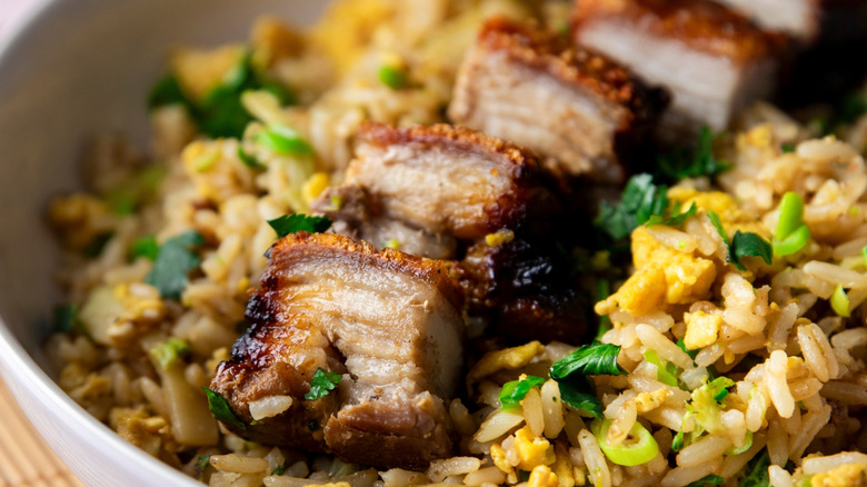 The key to choosing the perfect protein that will make your fried rice shine is picking something rich that will stand out when tossed into plain rice. A good amount of fat is key, and a stand-out flavor that hits your palate hard. You can't go wrong with pork in many forms — almost any cut will check all those boxes. But if you're all porked out, duck is another great option to upgrade your fried rice into something craveable. The rich aroma of duck fat will coat the plain rice with flavor, adding a creamy mouthfeel and juicy chunks of seared duck.