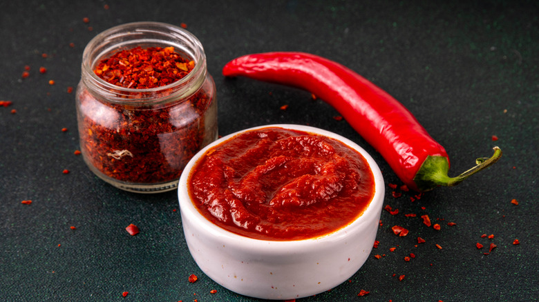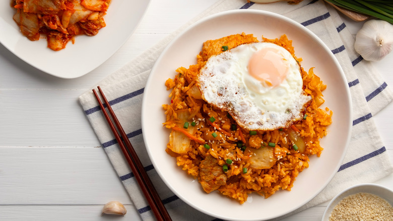 Gochujang is a chili paste that's an absolute staple of Korean cooking. If you ever fly a Korean airline, you're likely to get a toothpaste-esque tube of it along with your in-flight meal, as no Korean meal is complete without gochujang. Fried rice (or bokkeumbap in Korean) is no different. Gochujang will add a pop of color along with a consistent depth of spice and is commonly used in Korean fried rice dishes.