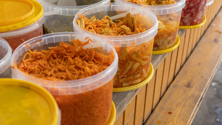 If you love the tart, vinegar flavor of pickles, try pickling your own shaved carrots or bell peppers at home. Use complementary flavors in the brine, like Sichuan peppercorns, rice vinegar, garlic, or ginger. You can definitely use pickled cucumbers, but avoid the typical American ones that are overtly sweet or use a lot of dill. A good, crunchy pickled cucumber typically starts with a garlic and salt soak, followed by a rinse and then brine. Persian cucumbers, which are smaller than a typical English cucumber, are a great option for this.