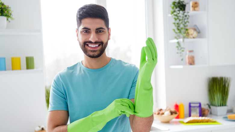 When it comes to summertime rituals, shucking fresh corn on the cob has got to be right at the top of the list. Whether you're grilling corn like Bobby Flay or making a batch of sweet corn ice cream, there's nothing more satisfying than peeling back the green husks to reveal the rows of fresh kernels underneath. There's one pesky obstacle to overcome before the corn can go in the steamer or boiling pot, though: removing all the corn silk. If you've ever wasted time trying to remove every stubborn, sticky strand one by one, it's time to embrace a better way. All you need is a clean pair of rubber dishwashing gloves and you can remove all the corn silk in seconds. No more endless picking, and no need to buy any single-use gadgets.
