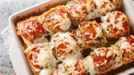 The process for making mini meatball sliders with your Costco haul is very easy. Bake the garlic parmesan rolls and cook the meatballs by following the package instructions. The rolls come in a foil base, which is the preferred pan for baking. The rolls should all bake together so that when you pull them apart, they'll have soft edges. Then all you have to do is slice the rolls in half, add a meatball and some sauce, and just like that you've got sliders. If you're adding cheese, top each of your meatballs with a slice and then bake or broil them in the oven until the cheese is melted to your liking.