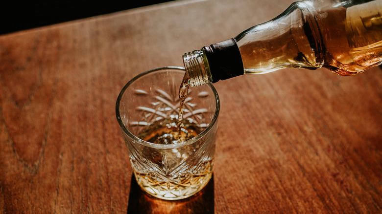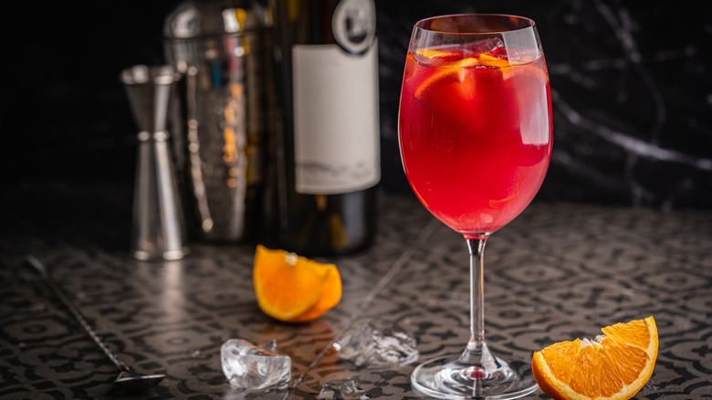 Another justification for reaching for wine lies in its ability to chill very well, especially compared to spirits. It's able to solidify at a higher temperature when stashed in the freezer, meaning the finished drink will still be blizzard-cold by the time it reaches your cup. The rendition assembled at Nothing Really Matters in New York City fused tart, juicy fruits to complement the vino, in this case, a red variant. "It's made with red wine, raspberry purée, orange juice, and a splash of dry Curaçao (I use Pierre Ferrand)," revealed Hicks. For a rich twist on the patio sangria, try punching up the juiciness with a spike of warm, hearty bourbon.