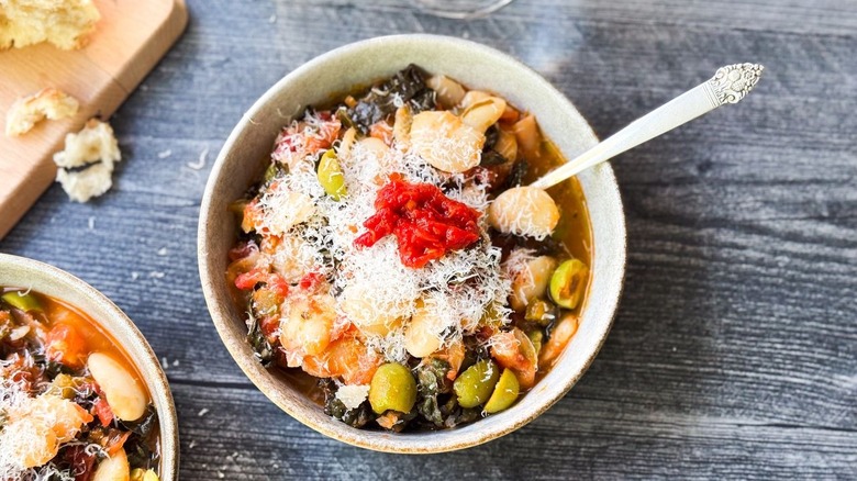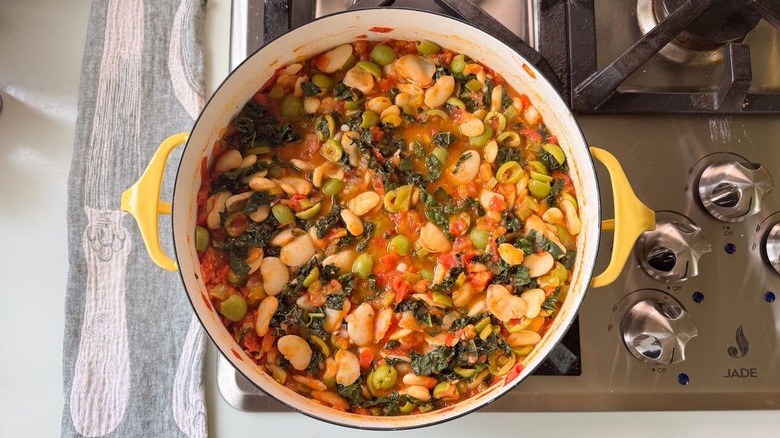 Dried beans are cooked with aromatics, tomatoes, anchovies, spicy Calabrian peppers, kale, and olives in our hearty vibrant Italian-style butter bean recipe.