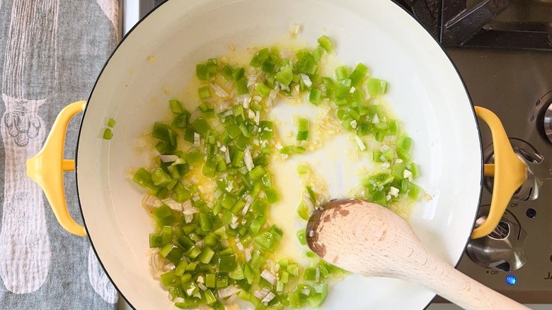 - Add the garlic, shallot, and green bell pepper, cooking and stirring occasionally for 5 minutes until softened.