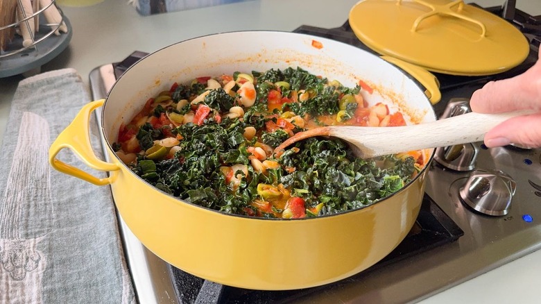 - Add the kale, sage, and thyme along with the reserved bean cooking liquid. Continue to simmer until reduced slightly (about 10 minutes).