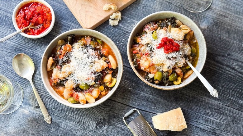 Kinnaird says that the beauty of this recipe is that it is perfect for putting your own culinary stamp on the ingredients and flavor profile. If you enjoy kalamata olives over green, make that switch for a slightly different take on the briny and buttery elements of the Castelvetranos. Try mixing in some Swiss chard, collard, or even mustard greens in place of the kale. Fresh rosemary or basil are great pairings to or substitutes for the sage. And if you find yourself out of tomato season, using good-quality diced canned or boxed Italian tomatoes is perfect for making this recipe in the winter months.
