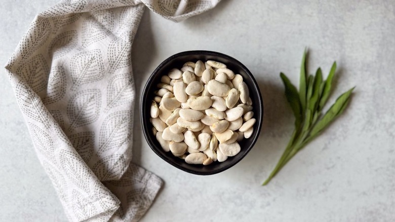 Dried butter beans are relatively easy to find amongst other dried varieties, but may be labeled as "large lima beans." These will be treated with a quick soak for this recipe for a creamy and tender result. Fresh garlic, shallot, and green bell pepper are sauteed in olive oil to give this dish an aromatic depth of flavor. Red, orange, or yellow bell peppers will also work, but Kinnaird likes the herbaceous flavor of the green. Ripe fresh tomatoes are an important base ingredient. You can use on-the-vine or other good Italian varieties of tomato, such as Roma or Genovese. Minced anchovies add a bit of salty umami richness, and dry white wine reduces down in the dish to add acidity and a citrusy brightness. Buttery and meaty castelvetrano olives add extra substance and pungency, and lemon juice and white balsamic vinegar balance the sweetness of the ripe tomatoes. Jarred Calabrian chilies and freshly ground black pepper add both heat and spice, and don't forget the salt for both cooking the beans and rounding out the flavor balance of the finished dish. Lacinto (Tuscan) kale is a sturdy variety that adds a hearty green element to the dish as well as nutritional value. Fresh sage and thyme add some herbal flair, and freshly grated Parmesan gives a nutty finish.