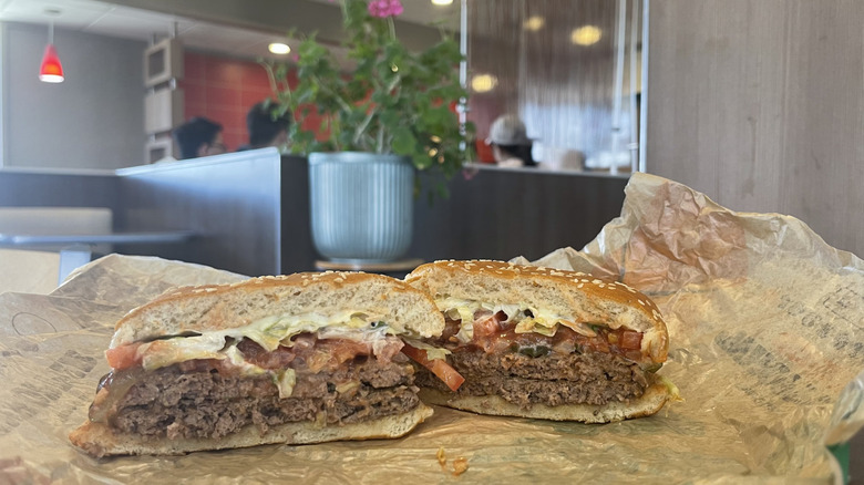 For an extra charge, you can add cheese to the Triple Whopper, which I highly recommend if you intend on ordering it (get some extra sauce packets too while you're at it). It was my least favorite burger on the Burger King menu simply because of the proportions of topping to patty — it was incredibly dry. If I'm hungry enough to want three patties, I would be much happier ordering three Jr. burgers that rated higher on this list. They come with a more proportionate amount of sauce, are more enjoyable to eat, and the price is comparable.