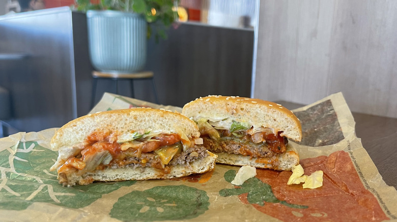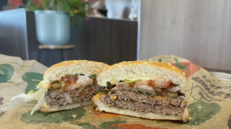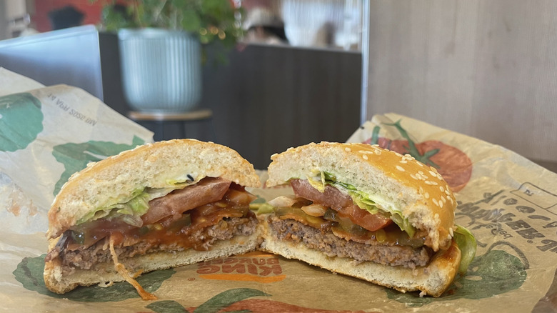 Impossible patties are one of many vegetarian options, allowing those who don't consume meat to still enjoy a burger. I was a bit apprehensive to try this burger, as I'm sure many meat-lovers can understand. Although I've had plenty of meat replacements before, I don't always find them enjoyable or appetizing. The Impossible Whopper surprised me, though. At first bite, it's clear that it's not a meat patty — but not in a bad way. It was a bit lighter in feel and flavor and came across more like an enjoyable sandwich than a burger. The patty had a bit more moisture than the meat patties, and was the perfect size for the bun. The generous amounts of pickles, veg, and sauce covered any potentially off-putting flavors and added a lot of texture and flavor.