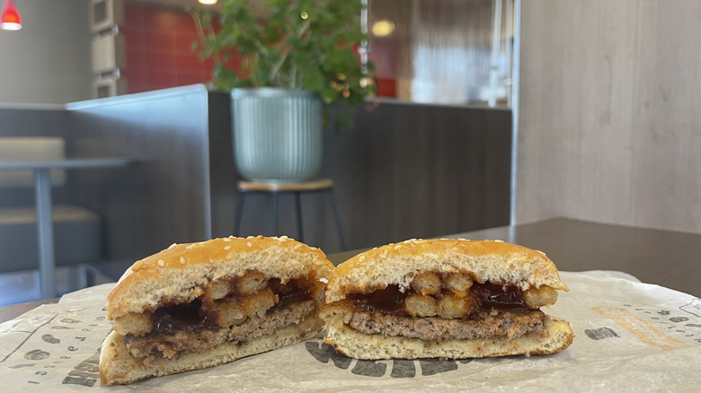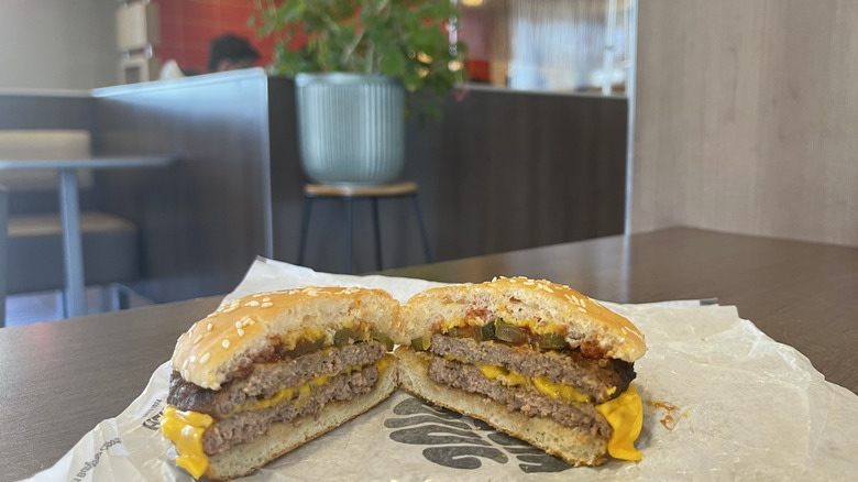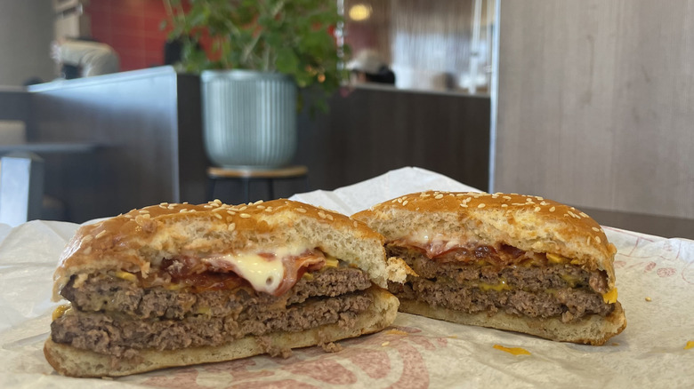 Still, the combo of bright pickles, melted cheese, ketchup, mustard, and bacon strips makes for a pleasantly enjoyable small-sized burger. The use of mustard rather than mayo adds a touch of spice to the overall flavor, which complements the bacon well. It's an all-around easy-to-understand burger, offering more appeal to the masses than a massive Triple Whopper or an Impossible burger. If you find the addition of bacon worthwhile, you'll probably enjoy this burger.