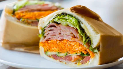First things first: There are some sandwiches you should wrap, and some you should leave as-is. Both hot and cold sandwiches can be wrapped (in fact, the wrap is great at helping cheese stay warm and melty on toasted sandwiches), but if you want to keep your sandwich from getting soggy, you'll need to use thick, crusty bread. Anything thinner, and the condensing is likely to cause your condiments to bleed straight through. It's also worth noting that the technique works especially well with a sandwich that's packed full with meat and cheese — try crumpling your cold cuts to squeeze extra protein into each layer, and don't be afraid to add a lot. It's what any self-respecting deli would do.