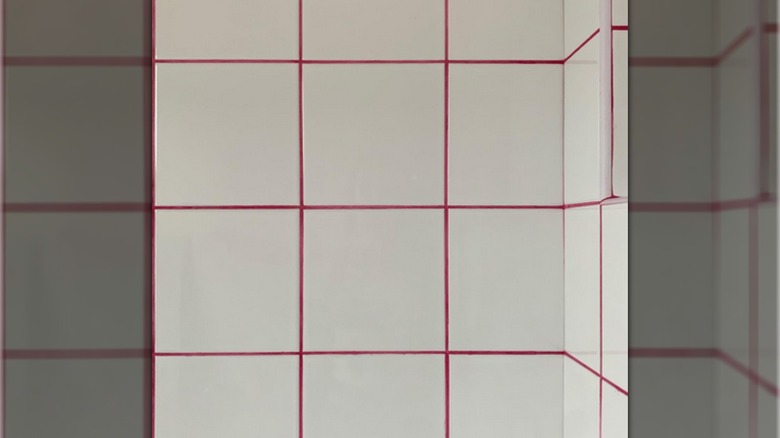 One trend that you might consider is thin lines of hot pink grout with white tiles. It's cute, and it's not as visually contrasting as you might think. The smaller the tile, the more grout you'll need, and the more apparent the grout will appear. Work with that to create the combination you desire — for example, if you want the color to be more of a highlight, use larger white tiles. If you really want that hot pink to be more obvious, use smaller tiles.