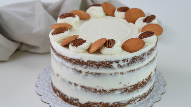 The great news is this delightful cake is not complicated to whip up. You can build your cake from scratch, or make life easier by adding spices to a boxed yellow cake mix. A good tip to keep this cake extra smooth is to shake your dry ingredients through a fine sieve so that your cake reaches maximum smoothness. Regardless, once you have your batter, simply add pumpkin pie spice for a flavorful, elegant cake. If you don't have pumpkin pie spice on hand, you can always make your own blend — centering cinnamon, ginger, nutmeg, allspice, and cloves.