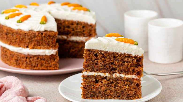Carrot cake is a timeless favorite for a reason — moist, flavorful, and just indulgent enough to feel special while giving "sort of healthy" vibes thanks to the veggies. To perfect your carrot cake, start with the carrots of course. Go for large carrots (not pre-cut baby ones) and use the small holes on a cheese grater for fine shreds that bake evenly into the batter. Food processors can over-chop the carrots and leave mashed chunks in your cake.