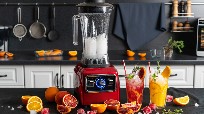 Making a frozen Aperol spritz with a blender is still possible, but requires a creative use of your ice cube freezer tray. Most trays hold around 1 ounce per cube, so you can pre-mix or split your Aperol spritz ingredients — say, four units of Aperol, four units of water, and four units of pure orange juice. It's okay if the Aperol doesn't completely solidify because of its alcohol content. After the cubes freeze overnight, throw them into the blender with an equivalent amount of Prosecco. The texture might not be as predictable as using a slushy machine, but you'll still have a refreshing frosted Aperol spritz to sip this summer.