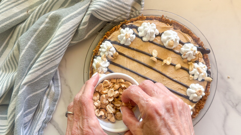 Make sure the whipped cream is chilled, so pull it out of the fridge right before you're ready to use it. Snip about ½-inch off the tip of a piping bag, then insert the star tip so that the star portion is fully visible and is secure and snug. Then place the point of the bag into a glass and cuff it over the edge of the glass to keep it open. Fill the bag about halfway with whipped cream and twist the open end tight just above the filling. Give the bag a squeeze to push the whipped cream towards the tip, then squeeze gently to release some of the whipped cream until it forms a star. Lift up and then repeat to add stars around the perimeter of the pie, and then top with chopped peanuts. If you don't want to use a piping bag and tip but still want a whipped cream frosting, just spread a layer on top with a frosting spatula, and top with shaved chocolate, drizzled chocolate sauce, or chopped nuts.