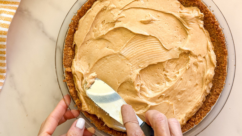 Spoon the filling into the prepared crust and spread it evenly. Refrigerate the pie for at least 4 hours or until firm.