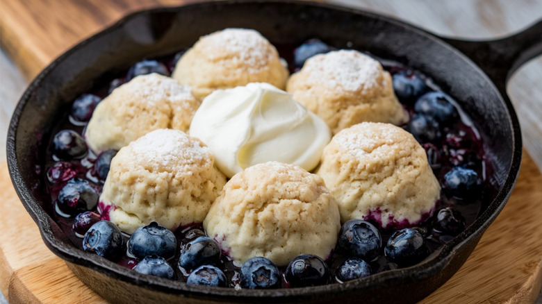 However, unlike a cobbler, which is baked in the oven, blueberry grunt is cooked entirely on the stovetop. The filling is made when fresh wild blueberries, which grow abundantly in Nova Scotia and New Brunswick. They're simmered with sugar and spices until they burst and release their juices. Then, soft biscuit dumplings are dropped on top and the pot is covered, allowing the dumplings to steam until they're puffed and fluffy.