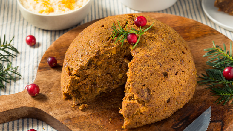 Based on classic British desserts like figgy pudding and spotted dick, Newfoundland's figgy duff is actually a boiled pudding that, despite its name, traditionally contains no figs at all. Instead, "figgy" refers to raisins in Newfoundland dialect, an expression that comes from Cornwall, England. The pudding is made with breadcrumbs, molasses, butter, and spices. It's then studded with dried fruit, wrapped in a cloth, and boiled until firm.
