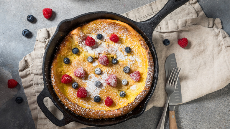 Though it's traditionally dressed with butter, powdered sugar, and a squeeze of lemon juice, as the Dutch baby spread to all corners of the United States, breakfast joints have started riffing on that original recipe. Nowadays, you can find Dutch babies in both sweet (fruits, jams, even Nutella-flavored) and savory (bacon, sausage, cheese, veggie) varieties.