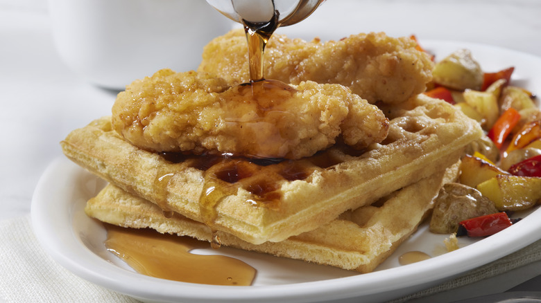 Though some claim chicken and waffles stemmed from Pennsylvania Dutch cuisine, that version isn't what most folks think of today — it includes a waffle, but the chicken is creamed and the dish is gravy-covered. That's in stark contrast to the soul food's symphony of textures and flavors. The fried chicken's crunchy exterior melts into a meaty interior, the savoriness of which juxtaposes perfectly with the sweet and fluffy — yet structurally sound — waffle, which supports both the fried chicken and a glug of maple syrup.