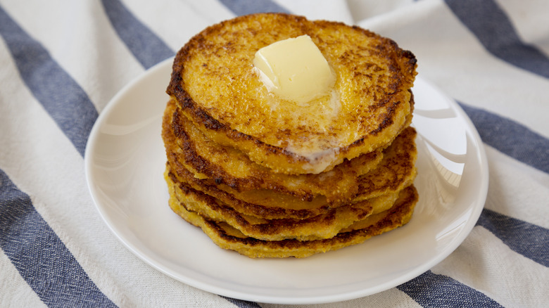 New Englanders typically call them "johnnycakes," and some believe that name is a derivative of "Shawnee cakes" — a reference to another indigenous tribe associated with the dish. Others insist that the name was originally "journeycakes," since the small patties held up well when traveling and could be a good source of energy during long journeys. If you head to the American South, you'll probably hear the name "hoecake" thrown around. Regardless of what you call them, johnnycakes are certainly worth munching on in the morning time.