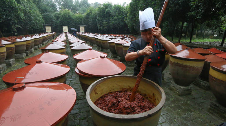 Longer-aged varieties are traditionally fermented in earthen crocks that are left in the sun and hand-stirred daily. Some factories have automated the process by using tractors with long arms to stir cement vats of the fermented paste. The Pidu District is known for having the ideal climate (moderate temperature with high humidity) to keep the paste from drying out too fast in the sun, thus allowing it to age longer.