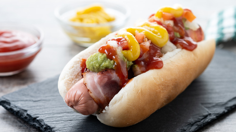 The Sonoran hot dog, named after the Sonoran desert where it originated, is a bold, delicious creation made by wrapping a hot dog in bacon, cooking it until crispy, and then topping it with grilled onion, pico de gallo, pinto beans, mayonnaise, mustard, ketchup, hot sauce, and a charred chili pepper. The dogs are served in a soft bolillo bun, which provides enough sturdiness to hold all of the dog with all of its toppings.