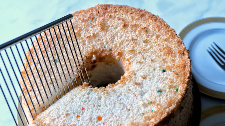Have you ever made a beautiful homemade cake, only to dread the moment when it's time to slice it? Even if you've waited for your masterpiece to cool down — and you're using proper knife techniques to slice a cake — it can be nerve-racking to cut through the delicate dessert. Instead of risking a collapse or crumbled pieces, consider using a retro solution: a cake breaker. The name is somewhat ironic since the last thing you want to do is "break the cake," but this tool ensures that delicate cakes stay solid. It was used to cut nostalgic cakes of the past, particularly delicate ones such as angel food and chiffon. Although sturdier than the other two, sponge cake still has a light, airy texture that the cake breaker would effectively slice through.