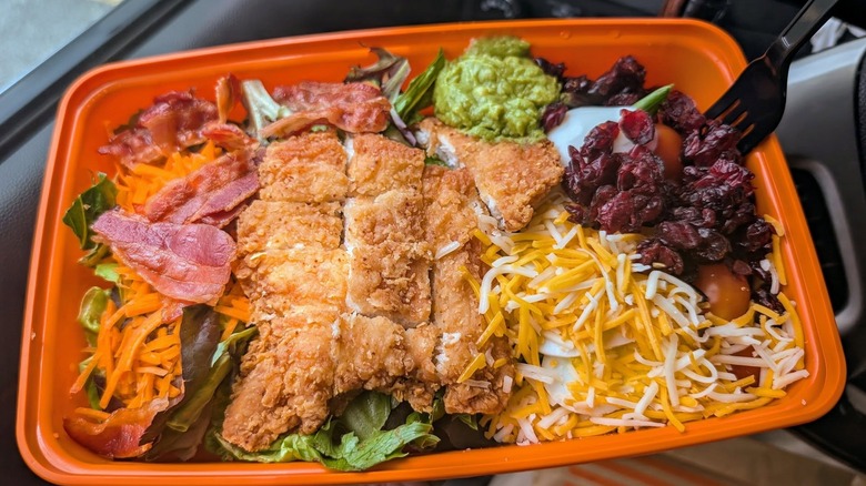The Cobb Salad comes with Whataburger's classic Whatachick'n, one sliced up hard boiled egg, shredded cheese, three bacon slices, six grape tomatoes, grated carrots and a Red Roma blend of seasoning with your choice of dressing. It varies in price, going from as low as $9.99 to over $12 in some places, with a few regions also offering it for around $10 or $11. It's a pretty steep price for a fast food salad, and its sister salad on the menu — the Apple & Cranberry Chicken Salad — is only slightly cheaper. At these prices, hopefully you'll be saying "what a salad" when you eat it.