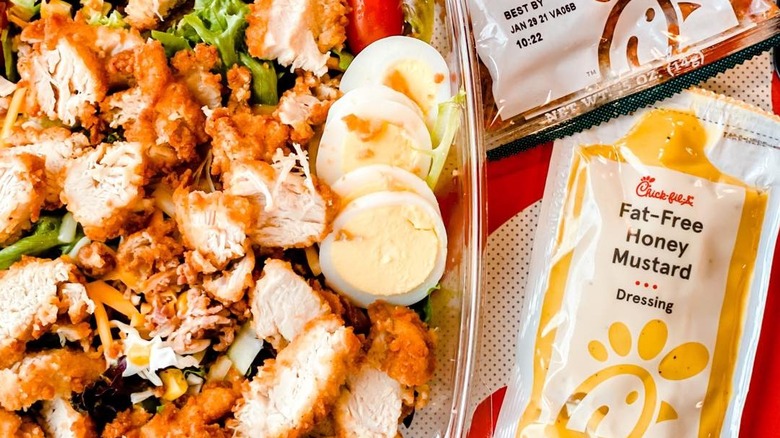 Salads aren't the first thing one might think to order at a fast food restaurant, but make no mistake: they do exist. While this salad isn't one of the most-ordered menu items at Chick-Fil-A, it's pretty substantial and packed with protein. The Cobb Salad with Nuggets comes topped with pieces of that classic Chick-Fil-A chicken and also includes grape tomatoes, roasted corn, bacon crumbles and sliced egg, topped with an avocado lime ranch dressing.