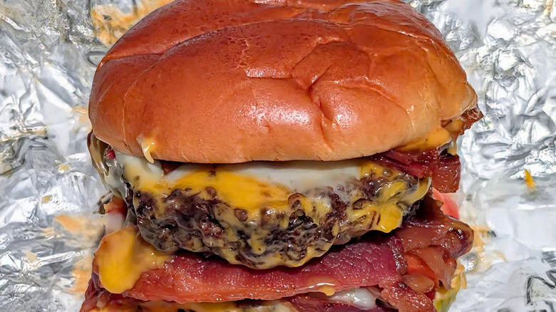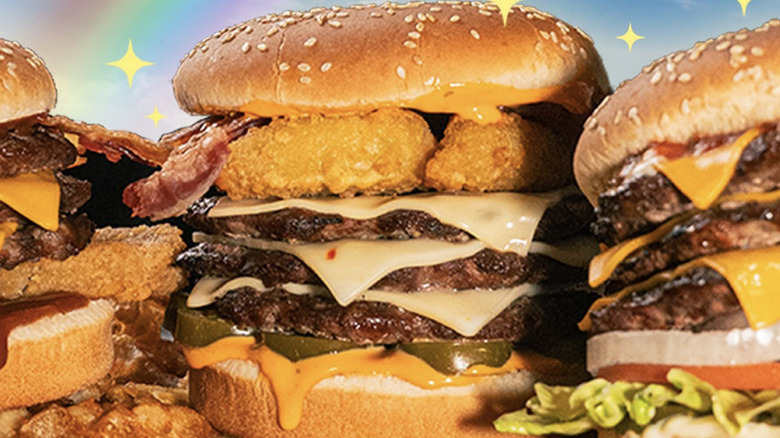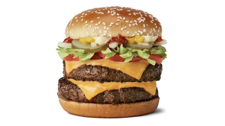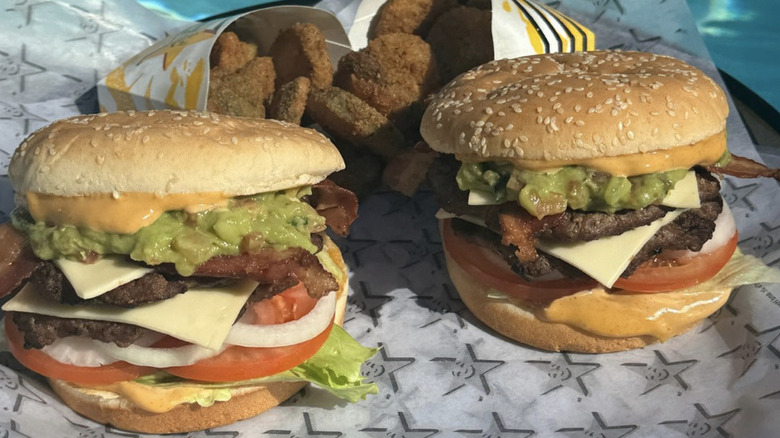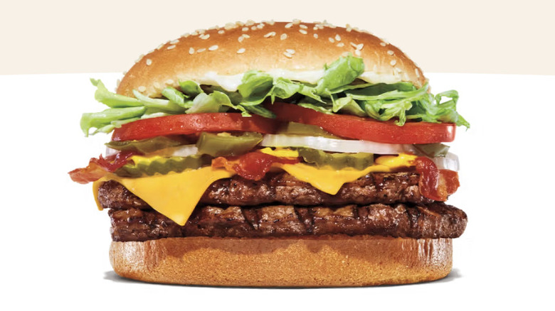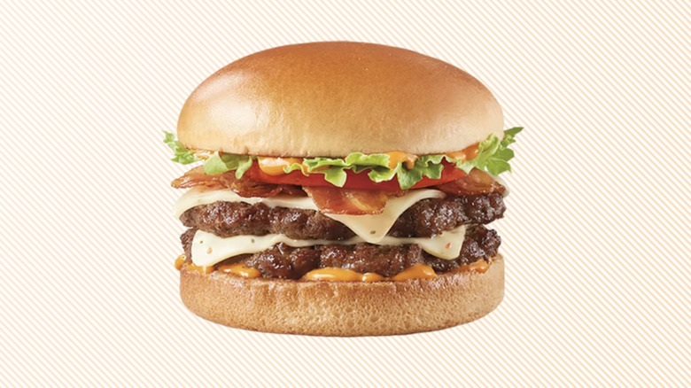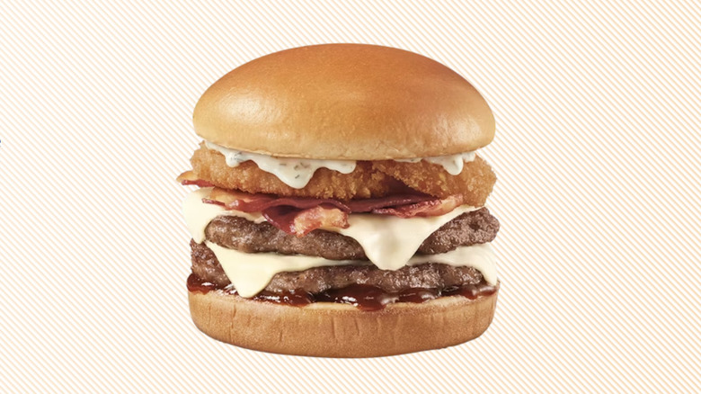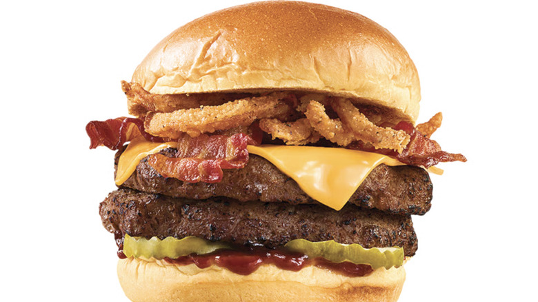 Arby's has stepped away from its signature roast beef sandwiches once again with yet another burger addition to its menu: the Double BBQ Bacon Burger. This burger consists of two all-beef burger patties, bacon, crispy onion strings, American cheese, BBQ sauce, and pickles on a brioche bun. This is a very similar burger to — and apparently Arby's take on — the popular Triple Western Bacon Cheeseburger from Carl's Jr. (mentioned above on this very list). The main difference seems to be that this burger has pickles.