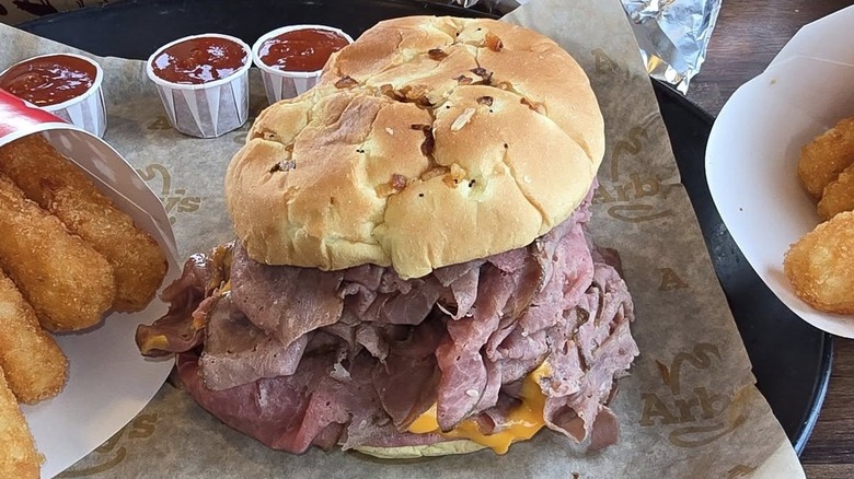 Arby's has long struggled to win over fast food fans over the years, despite letting everyone know that they "have the meats." This is somewhat due to the surprising facts we've learned about the roast beef at Arby's, including "liquid beef" allegations, a failing grade in 2024 for its antibiotics use in meat, and other questionable news stories. Despite the rumors, the roast beef at Arby's is real –- and there's a whole lot of it in this gigantic sandwich.