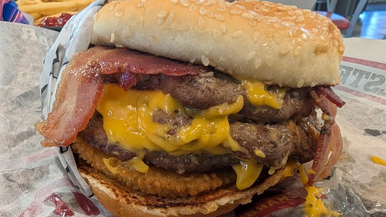 This big burger is another one of those menu items that vary greatly in price depending on where you live, going anywhere from a little under $9 all the way up to $12, with a usual price of around $11. This makes it the most expensive single item you can order at a Dairy Queen, including in Texas, where the menu is a little different. There, this burger looks slightly different with added tomatoes, Pepper Jack cheese instead of white cheddar, and a new name (the Jammin' Bacon BeltBuster).