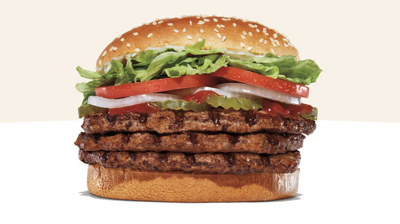 Also like its sibling, the Triple Whopper varies in price depending on what region you order it in. It can cost you anywhere from around $8 to close to $12, with a median price of around $10. Truly, these Burger King burger prices are all over the place. Want to make your Triple Whopper even more expensive, but also more delicious? The Triple Whopper is the perfect burger to test out the Burger King's Big Whopp menu hack.
